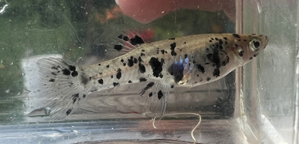 Coloration: These are normally a small gray fish with a few tiny black spots on the fins. The melanistic trait appears in the wild population on a small percentage of males giving them the dalmatian look of random black blotches and spots over a white or even translucent background. Females are a plain gray with the black spots in rows on the fins.